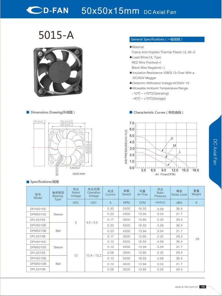 材料: 框架和叶轮:热塑UL 94-0 引线.UL类型 红色导线正极(+) 黑线负极(-) 绝缘电阻:10MΩ或以上,带DC250V高阻表 介电耐压:AC500V 1S 允许环境温度范围: -10℃-+70℃(运行) -40℃-+70℃(储存)